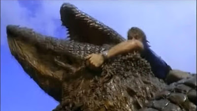 Starting with using the same Riz Ortolani score, KILLER CROCODILE 2 has all the tell-tale signs of a quickie sequel. While the crocodile set pieces are more over-the-top in terms of execution and splatter--with a climactic battle between Kevin and the croc that features an Anthony Crenna action figure attached to a toy croc in some shots that not even Antonio Margheriti would deem acceptable--the rest is padded with stock footage from the first film (including recycling the same initial appearance of the crocodile, which is just flipped) and absurdly longer-than-necessary establishing shots of buildings, people walking into offices, Crenna and Girolami on the boat, pans across the river, etc. It has to resort to these tactics just to make it to 87 minutes, yet somehow, top-billed Crenna doesn't even appear until around 40 minutes in. The actor is on hand for an interview in the KILLER CROCODILE extras (he now goes by "Richard Anthony Crenna") and explains that he went to Rome in the late '80s when his dad was working on a movie (most likely LEVIATHAN) and decided to test the waters of the Italian film industry since he wasn't catching any breaks in Hollywood. He quickly nabbed the KILLER CROCODILE gig, probably on the basis of his known surname, and recalls it being a fun shoot in Santo Domingo even though there were language barriers, the production got caught in a hurricane, and he contracted dysentery at one point. He returned for the sequel, which again took him to Santo Domingo, but when De Angelis offered him the lead in De Rossi's TERMINATOR ripoff CY WARRIOR immediately following the back-to-back KILLER CROCODILEs (and again scheduled to shoot in Santo Domingo), he turned it down because he was ready to return home, with the part eventually going to Frank Zagarino. Crenna's only notable acting job came with a recurring role on ROSWELL a decade later, as things ultimately didn't pan out for him like they did for his father. As with John Wayne's youngest son Ethan Wayne in 1985's THE MANHUNT and 1987's OPERATION: NAM, De Angelis did his best to make Anthony Crenna happen, but the young actor probably would've found more success in the Italian B-movie industry if he made the move a few years earlier. By 1989-90, the entire Italian genre scene was on life support aside from whatever Dario Argento or Michele Soavi were doing, as evidenced by neither KILLER CROCODILE film finding any US home video distribution.