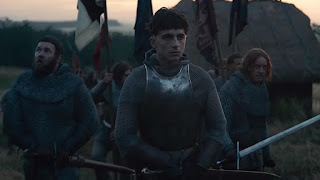 The cutthroat royal machinations are pretty familiar as far as these things go, and it's really a long buildup to Michod staging an epic, bloody, mud-soaked Battle of Agincourt in the third act. The friendship between Falstaff and Hal isn't explored to quite the depth that it was by Welles and his co-star Keith Baxter in CHIMES AT MIDNIGHT, and nothing here has the emotional gut-punch of the Welles film because the devastating rejection of Falstaff--when Baxter's Hal cruelly turns his back on him when he happily arrives for the coronation--never happens here. Co-produced by Brad Pitt, THE KING is well-made, well-acted, and looks great, but it doesn't really justify its existence beyond being a two-plus hour diversion that's sufficiently engrossing while you're watching it, but doesn't really stick with you when it's over. That is, unless you count Pattinson's insane performance as The Dauphin, where he manages to channel Klaus Kinski in AGUIRRE, Mickey Rourke in BARFLY, and Gary Oldman in THE PROFESSIONAL, then wraps it all in a French accent straight out of Pepe Le Pew. Portraying The Dauphin like some kind of flamboyant, medieval Batman villain, Pattinson doesn't show up until 75 minutes in, but after one condescending dressing-down of Henry V, you'll wish Michod would immediately get busy giving him his own Dauphin spinoff movie.