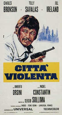 VIOLENT CITY finds Bronson in what would become his typical "vengeance" mode, but rather than taking out some punks who harmed his family and friends, a motif that would come to define his screen persona post-DEATH WISH, his Jeff is more of an enraged, heartbroken sad sack. His quest for revenge becomes more of a suicide mission as he plots to take out Weber's entire organization, all as a buildup to his revenge against Vanessa. Spaghetti western vet Sollima (THE BIG GUNDOWN, RUN MAN RUN) and his co-writers (among them a just-starting-out Lina Wertmuller) pull a nifty bait-and-switch by making you think Savalas' Weber is the antagonist, but it's really Vanessa. Weber is just another of her victims. Never a particularly strong actress and largely dismissed by critics because she was Bronson's wife and acted almost exclusively in his movies after she left MAN FROM U.N.C.L.E. co-star David McCallum for him, Ireland delivers what might be her best performance in VIOLENT CITY. Vanessa is revealed to be a classic femme fatale who destroys every man with whom she comes into contact. Witness the way she turns the strutting, larger-than-life Weber into a cuckold in dorky Coke-bottle glasses that constantly keep sliding down the bridge of his nose. Savalas plays this subtle shift beautifully, introduced with a completely self-aggrandizing monologue to Jeff and all but begging for his life when he realizes that he never really was in charge once he married Vanessa. But Sollima saves the best for the climax, a beautifully filmed, mostly silent set piece with Vanessa and the bottom-feeding Steve--who becomes her latest doomed paramour once Weber's out of the picture--in a glass elevator as Jeff, now the subject of a citywide manhunt after Weber's murder, takes them out from the top of a nearby building...and calmly waits for the inevitable. You could argue that Bronson is miscast in the role--he seems too old at times, especially when Weber and Killain both make references to his youth and inexperience in mob life; Bronson was a year older than Savalas and three years older than French actor Constantin. Sollima has said that the script was first offered to Jon Voight, then riding high on MIDNIGHT COWBOY, but when he declined, it made its way to Bronson, with whom Ireland came as a package deal. Putting Voight in the role of Jeff, things probably make a lot more logical sense, but Bronson obviously works because he's Bronson.