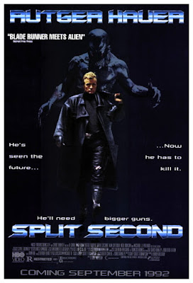Few films scream "early '90s at the video store" like SPLIT SECOND. After making a quick exit from American theaters in May 1992, the British import went on to be discovered by a more appreciative audience on home video, where it got a second wind and became a legitimate word-of-mouth cult hit. It's also an essential for fans of Rutger Hauer, by then a fixture in B-movies, with SPLIT SECOND being one of his best. He stars as Harley Stone, a renegade, plays-by-his-own rules cop in a near-future hellscape of 2008 London, with the city feeling the effects of global warming and largely submerged in perpetual flooding after 40 days and nights of torrential rain. It's a dark, dreary, smoggy, neon-lit, waterlogged hellhole with a production design that's typical of dystopian British cinema of the time, whether it's Richard Stanley's HARDWARE (1990), Bob Keen's PROTEUS (1995), and Stephen Norrington's DEATH MACHINE (1995) to name a few. Norrington would go on to direct big-budget Hollywood productions like BLADE (1998) and THE LEAGUE OF ORDINARY GENTLEMEN (2003), but before that, he worked on the effects and design crew of both HARDWARE and SPLIT SECOND, making him a key figure in this period of British genre fare. SPLIT SECOND had a long and troubled journey to the screen, with the script by Gary Scott Thompson (who would later go on to co-write THE FAST AND THE FURIOUS and subsequently cash in on that "Based on characters created by" action) initially making the rounds in 1988 as an L.A.-set Satanic serial killer thriller titled PENTAGRAM and written with Harrison Ford in mind. That never happened, as it ended up being put in turnaround after the similar Lou Diamond Phillips chiller THE FIRST POWER hit theaters in 1990.