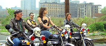 In 1990, the Bronx is declared a no-man's-land (a crawl explains that all "attemps" at law and order have been abandoned) and is ruled by warring biker gangs who know to keep to their own turf. The main gang is The Riders, led by Trash (Mark Gregory). Complications ensue when rich teenager Anne (Stefania Girolami, Castellari's daughter), who can't stomach being the heiress to the powerful Manhattan Corporation, which handles 60% of the world's arms manufacturing, flees Manhattan and heads to the Bronx. She's immediately attacked by a gang of hockey stick-wielding idiots known as The Zombies, but is rescued by Trash and welcomed into The Riders. Meanwhile, Manhattan Corporation honcho Fisher (Enio Girolami, Castellari's brother) sends in renegade cop Hammer (Vic Morrow) to find Anne and bring her back home. Hammer has other plans: born in the Bronx and sporting a huge chip on his shoulder about it, the self-loathing Hammer detests his origins and wants the Bronx to burn, and instead of doing his job and rescuing Anne, decides to plant evidence that he hopes will start a war between The Riders and The Tigers, the other major gang led by The Ogre (Fred Williamson). Hammer assumes that Trash and his old-school bikers and Ogre and his pimped-out henchmen will destroy each other and the Bronx in the process. He even gets help from Ice (John Sinclair), Trash's duplicitous second-in-command who has his eyes set on leading The Riders and needs Trash out of the way, resenting the influence Anne has on him ("Since he's hooked up with that Manhattan pussy, all the blood's rushed to his cock"). Hammer, fueled by rage and hubris and assisted by untrustworthy trucker Hot Dog (Christopher Connelly), gets sloppy and it doesn't take long for the not-very-brightTrash to figure out that they're being played. He's forced to journey across dangerous territory and face other rival gangs (including one called The Scavengers, who inexplicably grunt and dress like prehistoric cavemen) to get to The Ogre and convince him to band together to take on the insane Hammer, who's bringing along an army of cops for the subtly-named "Operation Burnt Earth."