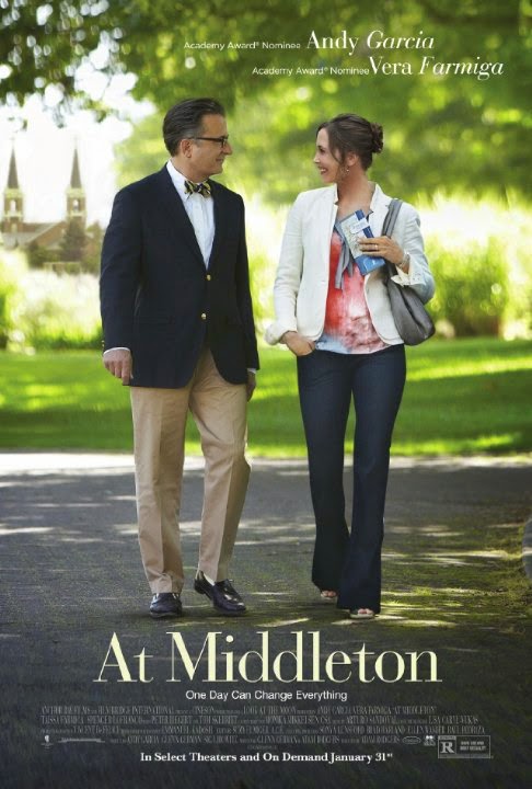 If you happen upon AT MIDDLETON in its last five minutes, you might think you missed a powerful, heartfelt look at two people who make a connection over the course of a day and are forced by the circumstances and the realities of their lives to part ways and return to their respective spouses. But if you watch the rest of the film leading up to that finale, you'll get a grating, phony, and pandering middle-aged rom-com filled with obvious jokes, cliched plot turns, cardboard characters, and some frequently atrocious acting, the kind of fawned-over festival favorite that ultimately gets dumped on 20 screens with little fanfare. There's a good film to be made--one that could deftly balance drama and comedy--about parents of an only child facing an empty nest when that kid goes off to college, but until its surprisingly poignant ending, AT MIDDLETON takes the easy route to stale laughs and even staler drama nearly every time and has almost nothing substantive to offer. Taking place over one day at the mid-level, mostly average Middleton College, the type of place no one really wants to go but they just sort-of end up there, AT MIDDLETON finds heart surgeon George Hartman (Andy Garcia) and his son Conrad (Spencer Lofranco) arriving for a campus tour when George has a meet-cute with Edith Martin (Vera Farmiga), when she steals his parking spot. Edith is there with her ferociouly ambitious daughter Audrey (Farmiga's little sister Taissa of AMERICAN HORROR STORY; there's a 21-year age difference but they look so much alike that the initiallly odd casting works). George is a milquetoast sort who wears a bow tie, while Edith is brash, loud, and free-spirited and prone to embarrassing Audrey. Gee, is there any way opposites won't attract and that dweeby bow tie won't be undone before the end of the movie?