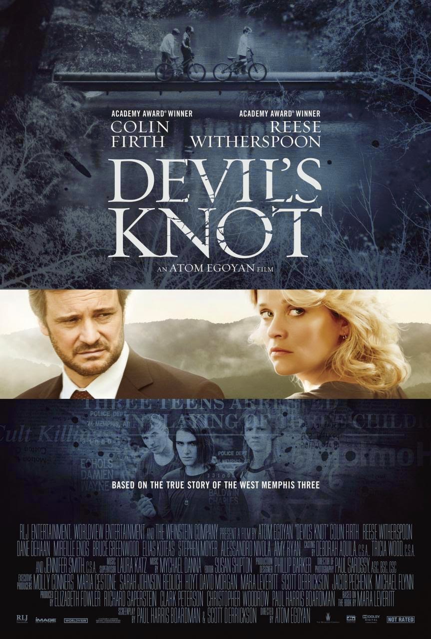 All the expected story elements are here: the parents demanding revenge, the town, the lazy police, and a stone-walling judge going into full-on, witch-hunt, "Satanic panic" mode. They're all in a frothing-at-the-mouth quest to pin the murders on a trio of social outcasts who had an interest in the heavy metal and the occult and a ringleader in Damien Echols (played here by James Hamrick) who was a loner from a broken home who dressed in black and was simply deemed "weird." The police work in this case was horribly shoddy, with one suspect, Jessie Misskelley, Jr (Kristopher Higgins), obviously mentally incompetent and thought to be "mildly retarded," coerced into confessing to the murders with wrong timelines and details completely inconsistent with the crime scene, but the cops ran with it anyway. Since these details, and the eventual Alford Plea release of the three convicted murderers in 2011 are old news, a lot of DEVIL'S KNOT focuses on the grieving Pam Hobbs (Reese Witherspoon), the mother of victim Stevie Branch, and her late discovery of Stevie's pocket knife in a box kept by her husband Terry (Alessandro Nivola). This, along with another knife that was given to Sinofsky and Berlinger (who briefly appear as themselves) by John Mark Byers (a hammy Kevin Durand), the father of victim Christopher Byers, and the police department's botched handling of a bloodied African-American man who was found in the ladies' room of a fast-food restaurant the night of the murders, would appear to indicate DEVIL'S KNOT's agenda in probing deeper into the case. If Egoyan was really interested in that, why not pursue Terry Hobbs and John Mark Byers for a documentary? Why devote time to defense team investigator Ron Lax (a miscast Colin Firth, struggling with a Southern accent) moping around after his wife (a one-scene drop-in by Amy Ryan) serves him with divorce papers? Who gives a shit about Ron Lax's failed marriage? This is the kind of film where the judge decrees to a packed courtroom that Misskelley will be tried separately from the others, but Lax still has to immediately lean over to his assistant and whisper "Separate trials...Jessie's gonna be tried on his own" just in case the audience is having trouble keeping up. With Oscar-winners Firth and Witherspoon onboard, and with justice for the West Memphis Three a longtime cause for many in the entertainment industry, DEVIL'S KNOT looks suspiciously like transparent Weinstein Company awards bait, but this time it backfired. The film got such a unanimously negative response at the 2013 Toronto Film Festival that Harvey Weinstein unloaded it on RLJ Entertainment, who rolled it out on VOD and a handful of screens a month before its DVD/Blu-ray debut. It's a strangely appropriate burial for such a shallow endeavor that barely scratches the surface as it treads down a path that's already been explored in much more insightful detail by others. (Unrated, 114 mins)