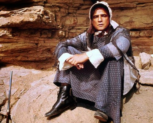 This was Brando's first film appearance in three years, and it's essentially the beginning of the final phase of his career: the "I'm just going to riff and do what I want because I'm Marlon Brando and I'm getting paid more than everybody else here" phase. This is the Brando who showed up on the APOCALYPSE NOW set without having read the script and opting to intentionally stall filming because his contract stipulated that he stood to make more money if he was still needed after a certain date. This is the Brando who wore an ice bucket on his head for no reason in THE ISLAND OF DR. MOREAU. This is the Brando who was now almost openly contemptuous of his craft and the whole concept of Hollywood. Brando had a history of being difficult and, at least with 1969's THE NIGHT OF THE FOLLOWING DAY, purposefully attempting to sabotage a film with his antics, but while he may be undisciplined, unfocused, and impossibly hammy in THE MISSOURI BREAKS, he's doing what he needs to do keep things interesting, and from the looks of it, he's having a blast. Penn directed Brando in 1966's underrated THE CHASE, which contains one of the actor's best performances from his mid-to-late 1960s downward spiral. Only a decade had passed, but it wasn't the same controlled, serious Brando who showed up to work on THE MISSOURI BREAKS. Brando first appears around the 35-minute mark, hanging off a horse and sporting an over-the-top Irish brogue that sounds like a tribute to his MUTINY ON THE BOUNTY co-star Richard Harris. His performance is a parade of eccentricities that starts off quirky and rapidly escalates to gonzo. He walks into Pete's funeral, roughs up the body, lying in ice in a casket, and proceeds to grab some ice cubes and rub them all over his face. Elsewhere, Brando's Clayton dons a variety of costumes in his pursuit of Logan's gang, disguising himself as a mandolin-strumming preacher mumbling through mouthful of tobacco and later, maniacally cackling in drag in a frontier granny dress as he hurls a spike through someone's head. He sets another on fire while screaming "Smoked meat!" He plays with bubbles in the bathtub. He taunts Braxton while wearing a dorky derby and munching on a plate of raw carrots like a distinguished Bugs Bunny. When Braxton tells Clayton "You're out of control!" it's hard to tell if McLiam is in character or talking to Brando personally. Brando treats the entire project as a self-indulgent, absurdist playground, opting to goof off to his heart's content on United Artists' dime (interestingly, the studio would go bankrupt in four years with another revisionist western, Michael Cimino's much more costly and similarly-reviled-and-now-reconsidered HEAVEN'S GATE), but unlike some of his later films (CHRISTOPHER COLUMBUS: THE DISCOVERY, anyone?), no one can accuse him of phoning this one in. 1976 audiences might've been pissed off, but Brando was having the time of his life.