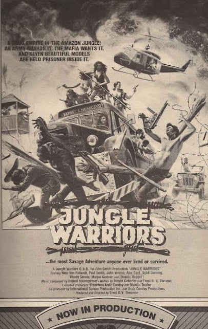 theme, quite possibly the worst song ever recorded. In addition to the headaches involving Hopper, the film also switched directors early in the shoot, with veteran German producer Ernst R. von Theumer giving Billy Fine the axe and taking over direction himself. Fine was also a producer on CHAINED HEAT and 1982's THE CONCRETE JUNGLE, and JUNGLE WARRIORS was set to be his debut behind the camera. Von Theumer had been a journeyman in German B-movies going back to the late 1950s (he also directed the 1972 Roger Corman pick-up
