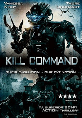 It offers little in the way of innovation, but KILL COMMAND is a not-bad B-movie that wears its '80s influences on its sleeve in a straightforward and dignified fashion. While its ideas echo classics like ALIENS and PREDATOR, it's really more like a sci-fi DOG SOLDIERS with a dreary, dystopian production design that Blockbuster Video regulars of a certain age will recall from 1990s straight-to-VHS Vidmark Entertainment fare like CYBORG 2 and DEATH MACHINE. Set in the near-future, KILL COMMAND has cyborg scientist Mills (THE CROWN's Vanessa Kirby) being sent by her employers at Harbinger to accompany a group of hard-ass US Marines on a routine training exercise on a remote island. Harbinger deals in weapons manufacturing and combat technology (and, judging from its name, pure evil), and Mills is their top programmer. She recognized a flaw in the code of their soon-to-be-rolled-out line of robot soldiers and is to observe the Marines in their mock combat with the robots on the island to see how the machines respond. After some extended set-up involving a lot of macho ballbusting and the establishing of everyone's mistrust of Mills, from no-nonsense Capt. Bukes (FLAME AND CITRON's Thure Lindhardt) on down, differences are set aside when Mills figures out one of the robots has gone HAL 9000. It's now capable of making its own decisions, programming the rest to mimic the battle action of the Marines and using the military's own techniques against them but with live ammo. After several are killed in the initial skirmish, Mills and the remaining survivors make their way to an abandoned compound for your standard-issue RIO BRAVO/John Carpenter scenario, with a small band of heroes fighting off the onslaught of sentient robots trying to get inside.