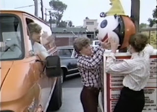 With the ground rules set, the rest of the movie basically consists of acts of wanton slapstick destruction as a bunch of actors run and flail around, shouting, screaming, and mugging shamelessly as they do whatever it takes to get the items on their list. This leads to scenes where the servants have to steal a toilet, Selsome has to move a huge safe from the top floor of a building with an out-of-service elevator, Kenny has to tear the clown head off the drive-thru order speaker at a Jack-in-the-Box, and Dummitz has to disguise himself as a mummy, for some reason. Other objects on the list include tennis rackets, laughing gas (yes, it leads to a scene with everyone hysterically laughing), a fat person (yes), false teeth, a bulletproof vest, a globe, five ostriches, a stuffed fish, an oar, a stroller, a medicine ball, a table, assorted kitchenware, a football helmet, an old cylinder phonograph, etc. By the time of the climactic car chase with everyone heading to the Parker mansion with the random junk spilling out of their vehicles, SCAVENGER HUNT starts to look like an unfunny hybrid of IT'S A MAD MAD MAD MAD WORLD and SANFORD AND SON. As in IAMMMMW and other similar, star-studded comedies that send their large casts on a madcap pursuit (THE GREAT RACE, THOSE MAGNIFICENT MEN IN THEIR FLYING MACHINES, THE GUMBALL RALLY, MIDNIGHT MADNESS, THE CANNONBALL RUN, GREEDY, THE RAT RACE, etc), other parties end up joining the ensuing fracas, including a bridal shop security guard (Scatman Crothers), three obese people (Stuart Pankin, Stephen Furst, and Marji Martin) who are among the "items" and exist only to be the butt of endless "fatty eats and/or falls down" jokes, an old Native American (Jerado Decordovier) whose dentures were stolen by Selsome, and a lisping, Sylvester the Cat-sounding zookeeper (Avery Schreiber), looking for his stolen ostriches. Various parties also cross paths with a batty old weapons nut (Ruth Gordon), fearsome motorcycle gang leader Scum (Meat Loaf), and pumped-up gym trainer Lars (Arnold Schwarzenegger).