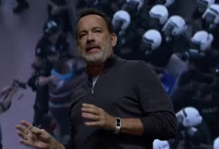 Mae's advance up the ladder at The Circle puts a strain on her friendship with Annie as well as her relationship with her parents, who are also required to install cameras at their house. Those cameras are taken offline when Mae's followers, seeing what Mae sees, accidentally catch a glimpse of her parents having sex with the aid of a penis pump for her disabled father, humiliating both of them. Mae also forms a muddled alliance with Ty Lavitte (John Boyega of STAR WARS: THE FORCE AWAKENS), a legendary hacker who works for The Circle, designing a program that's been hijacked by Bailey and his business partner Tom Stenton (Patton Oswalt) to spy on every Circle user and store all of their personal information, phone calls, e-mails, texts, etc. Much to Lavitte's disgust, Bailey and Stenton use this information to blackmail a senator (Eve Gordon) who's been publicly critical of The Circle, and with Mae's help, they even concoct a plan to tie The Circle into voter registration records and not only allow users to vote through their Circle account, but require them to be Circle users in order to vote ("The US government needs us more than we need them," Stenton says). There's some heady implications in a lot of what goes on in THE CIRCLE, especially the ultimate fate of Mercer as a scathing critique of social media hysteria, but Ponsoldt bungles it at every turn. THE CIRCLE is content to lecture the audience and too often comes off like it's taking an approach to technology that's equal parts Stubborn Luddite and Scared Old Man. What could've been a smart, topical critique of our reliance on technology and our willingness to sacrifice privacy and human interaction for convenience and a feeling of connection with the rest of the world comes off as smug and sanctimonious, complete with a laughably simplistic non-ending that has Mae staging a revolt against Bailey and Stenton and literally Pied Pipering her newly-woke colleagues out of a darkened, pitch black auditorium through an exit door, outside into the light. Watson is a capable actress but she's strangely one-note here. Boyega seems to have been affected most by the reshoots, looking like he spent his entire time on the set unsuccessfully trying to locate Ponsoldt, while Paxton musters what trace amounts of dignity he can with a penis pump and in another scene that requires him to piss himself. What little novelty this misfire offers comes from seeing Hanks and Oswalt atypically cast as quietly sinister villains, but neither seems to have spent more than a few days working on this, enough for one to surmise that when Bailey turns to Stenton at the end and says "We are so fucked," it's very possible that it was just Hanks talking to Oswalt without knowing the cameras were rolling. Altered extensively from Eggers' novel, THE CIRCLE is disjointed, already past its sell-by date, and completely unsure of what point its even trying to make.