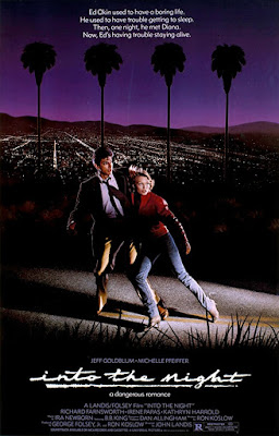 Just out on Blu-ray from Shout! Factory, John Landis' INTO THE NIGHT has often been compared to Martin Scorsese's AFTER HOURS, another 1985 film with a similar concept of an ordinary guy finding himself in increasingly strange situations in the wee hours of the morning in unfamiliar and dangerous parts of the city. Where AFTER HOURS was set and shot in NYC, INTO THE NIGHT represents the west coast, taking place in and around Los Angeles (there's even a couple of chances to see some vintage TV commercials for legendary L.A. car dealer Cal Worthington). In hindsight, INTO THE NIGHT is often relegated to the sideline and viewed as a lesser AFTER HOURS knockoff, even though it opened seven months earlier. Landis had been on a hot streak going back to 1977's THE KENTUCKY FRIED MOVIE, with a string of huge hits that included 1978's ANIMAL HOUSE, 1980's THE BLUES BROTHERS, 1981's AN AMERICAN WEREWOLF IN LONDON, and 1983's TRADING PLACES, plus he was at the helm of Michael Jackson's "Thriller," the groundbreaking and probably the most famous music video of all time. INTO THE NIGHT grossed a very modest $7 million, not awful by 1985 standards but far below the box office Landis films generated in that period. While TRADING PLACES became a blockbuster thanks largely to Eddie Murphy, INTO THE NIGHT didn't have that kind of star power to headline it. This meant Landis' name was the main focus, and the deaths of Vic Morrow and two children on the set Landis' segment of 1983's TWILIGHT ZONE: THE MOVIE were still fresh in everyone's minds, particularly the director himself, as Landis was officially charged with involuntary manslaughter three weeks into filming INTO THE NIGHT, with a trial spread out over 1986 and 1987. Though Landis and three co-defendants were eventually acquitted, and he continued working in Hollywood (having hits with 1985's SPIES LIKE US, 1986's THREE AMIGOS, and 1988's COMING TO AMERICA), Landis' career never really recovered. His subsequent work in the '90s ranged from middling (1992's INNOCENT BLOOD) to quick paycheck (1994's BEVERLY HILLS COP III, six years after he and Murphy clashed on COMING TO AMERICA, prompting Murphy to quip "John Landis has a better chance of working with Vic Morrow than with me") to desperate (1998's BLUES BROTHERS 2000) to completely unwatchable (1996's THE STUPIDS). Landis has worked very sporadically over the last two decades, with a couple of acclaimed documentaries (2004's SLASHER and 2007's MR. WARMTH: THE DON RICKLES PROJECT), but that nearly 20-year stretch has only seen Landis directing one narrative feature with 2011's dismal, little-seen Simon Pegg horror comedy BURKE AND HARE. His last directing credit to date is a 2012 episode of the TNT series FRANKLIN & BASH.