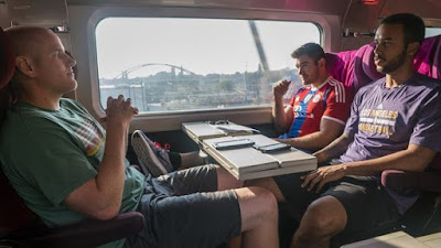 To be fair, the attack aboard the train is very well-done and this is where Stone, Skarlatos, and Sadler really come alive. They lived it, they know exactly how it went down, and Eastwood wisely let them do their thing. But that's a few minutes of an otherwise misbegotten misfire. Eastwood's worked with non-professional actors before on GRAN TORINO, and the results were still occasionally awkward but the entire film didn't rest on the shoulders of Bee Vang and Ahney Her. Stone, Skarlatos, and Sadler are true heroes, but they're not actors, and prior to the thwarted attack on the train, they aren't even remotely convincing as buddies even though they've known each other since childhood. This is hardly their fault. Eastwood is a laid-back director, but he's notoriously impatient even with professional actors, and it's well-known that he gets annoyed if he has to do more than two takes. This is how he always comes in under budget and ahead of schedule. I'm sure he extended some leeway to the trio of stars, but a lot of this film looks like first or second takes, and the semi-improv travel bits don't even look like they're the work of Eastwood. THE 15:17 TO PARIS keeps coming back to Spencer's feeling that he's destined for something of great purpose (which is more than you can say for THE 15:17 TO PARIS), and it's a premonition reiterated by Alek's mother. But the way it's presented here, it's just a hackneyed plot device clumsily foreshadowing their heroism. It's hard telling what Eastwood wanted to accomplish here. He could've made a documentary short subject if he found the story that interesting. But at feature-length, he's scrambling for things to pad the running time but can't even be bothered to show the three guys reuniting after years apart: Spencer and Anthony are in Italy about to head to Germany to meet with Alek, and in the very next shot, they're dancing in a club packed with wall-to-wall people, and Anthony's buying Alek a drink. Wait...they're in Germany? And they already reunited with Alek? Wouldn't that be worth showing instead of Anthony taking a pic with his selfie stick for the 37th time?
