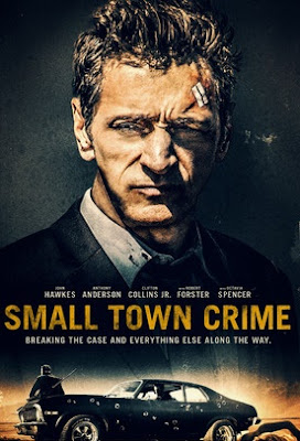 Another entry in the new wave of gritty noirs that's given us acclaimed films like COLD IN JULY, BLUE RUIN, BAD TURN WORSE, I DON'T FEEL AT HOME IN THIS WORLD ANYMORE, and the similarly-titled SMALL CRIMES, SMALL TOWN CRIME is a terrific thriller that also owes a debt to BLOOD SIMPLE-era Coen Bros. Despite the obvious influences, the sibling writing/directing team of Esham & Ian Nelms (WAFFLE STREET) throw in enough unpredictable twists and turns and interesting characters that SMALL TOWN CRIME manages to find its own voice and place in the subgenre. Character Actor Hall of Famer John Hawkes stars as Mike Kendall, an alcoholic and disgraced ex-cop booted off the force after a traffic stop went bad, resulting in his partner getting shot in the head by the driver, a psycho who had a kidnapped girl in the trunk who was accidentally shot dead by Kendall, who was shitfaced on the job in the police cruiser and just started randomly firing when his partner went down. Unable to get a job and getting so blackout drunk every night that it's not uncommon for him to wake up in a field 100 yards away from his old-school Nova littered with empties on the dashboard, Mike is driving home on one such morning after when he spots a bloodied and barely-breathing young woman lying on the side of the road. He drives her to the hospital, but she dies shortly after. He finds her phone under his passenger seat and has a testy conversation with criminal lowlife Mood (Clifton Collins Jr), who keeps calling the girl's phone incessantly. After being threatened by Mood, Mike draws three conclusions: the dead girl was a prostitute, Mood was her pimp, and he obviously doesn't know she's dead. Even though he's in a drunken blur most of the time, this awakens his long-dormant cop instincts and he's unable to let it go, even after being told to back off by homicide detectives Crawford (Michael Vartan) and Whitman (Daniel Sunjata), both of whom know and, more so with Whitman, still resent him over his exit from the department.
